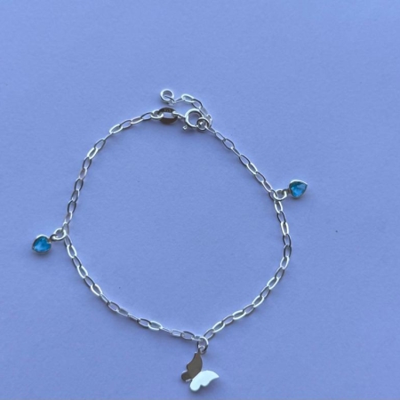 • Pulseira Feminina 2 Corações Turquesa e Borboleta Prata 925