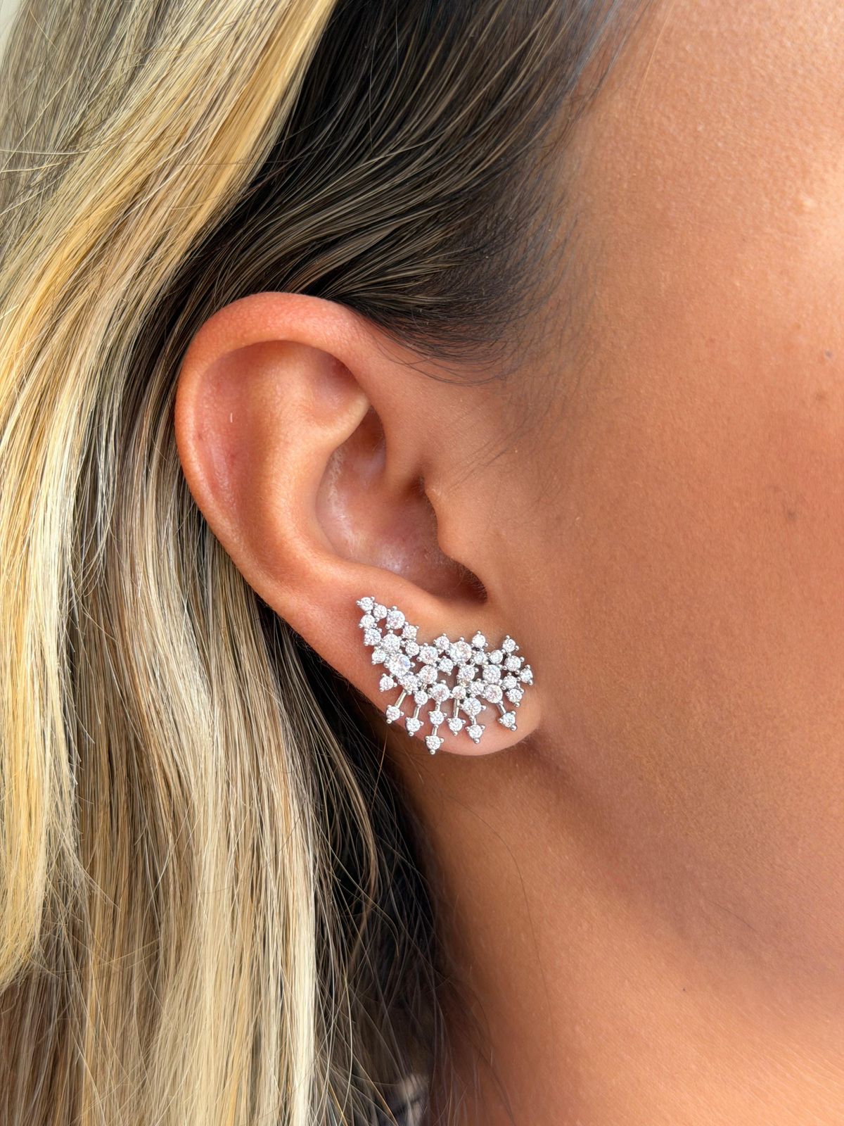 Com formato de Earcuff, ele possui uma pedras cravejadas, que transmite delicadeza e luminosidade.