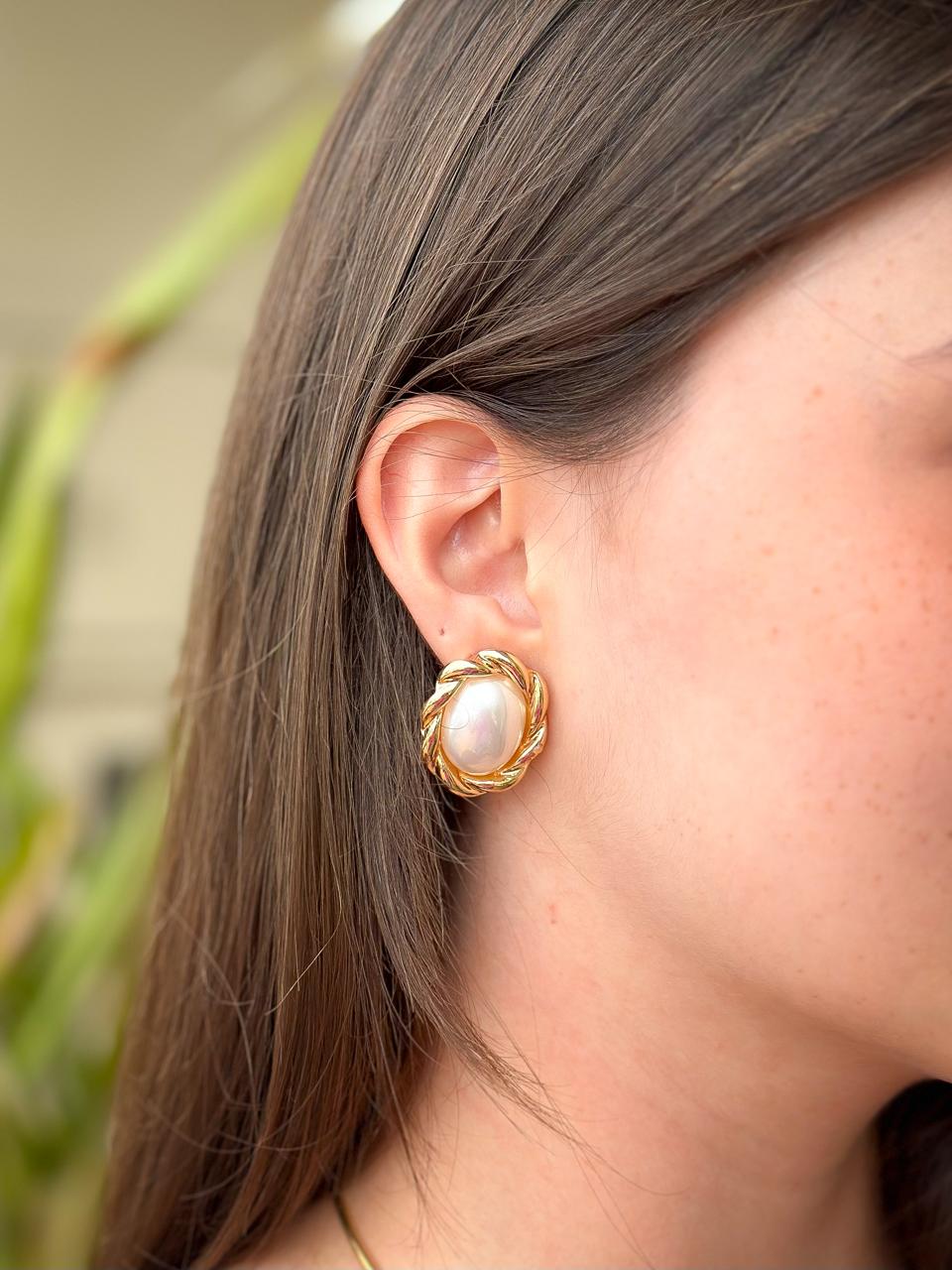 Ele possui design em formato oval com uma pérola central, que traz delicadeza e luminosidade à peça. Ao redor da pérola, o acabamento dourado apresenta um trançado delicado, criando um efeito de moldura que valoriza ainda mais a pedra e adiciona textura ao brinco.