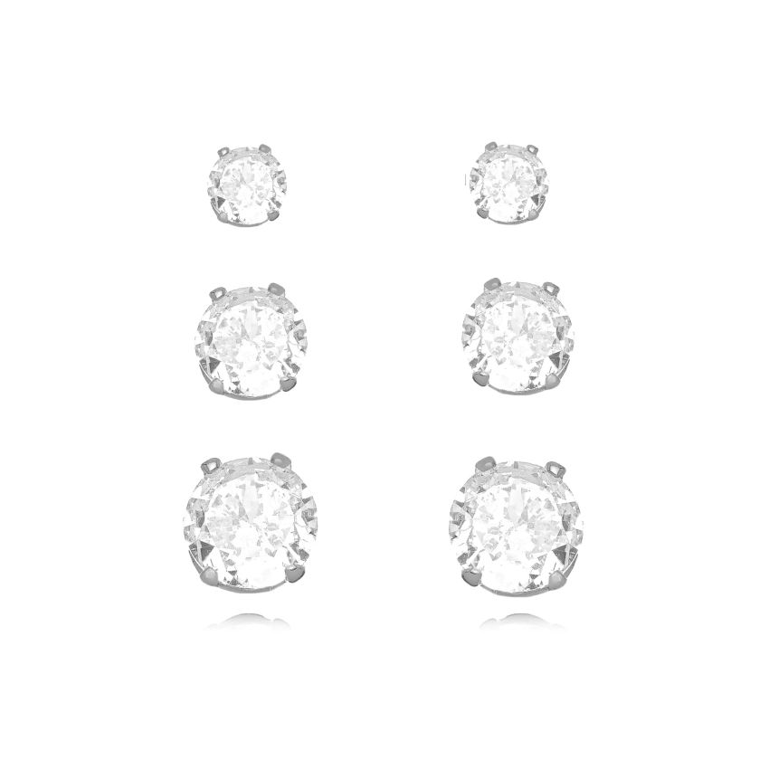 O conjunto traz três tamanhos diferentes de pontos de luz, todos com pedras brilhantes que refletem a luz de forma incrível, garantindo um visual sofisticado e atemporal. A cravação delicada valoriza ainda mais o brilho da pedra, deixando a peça ainda mais elegante.