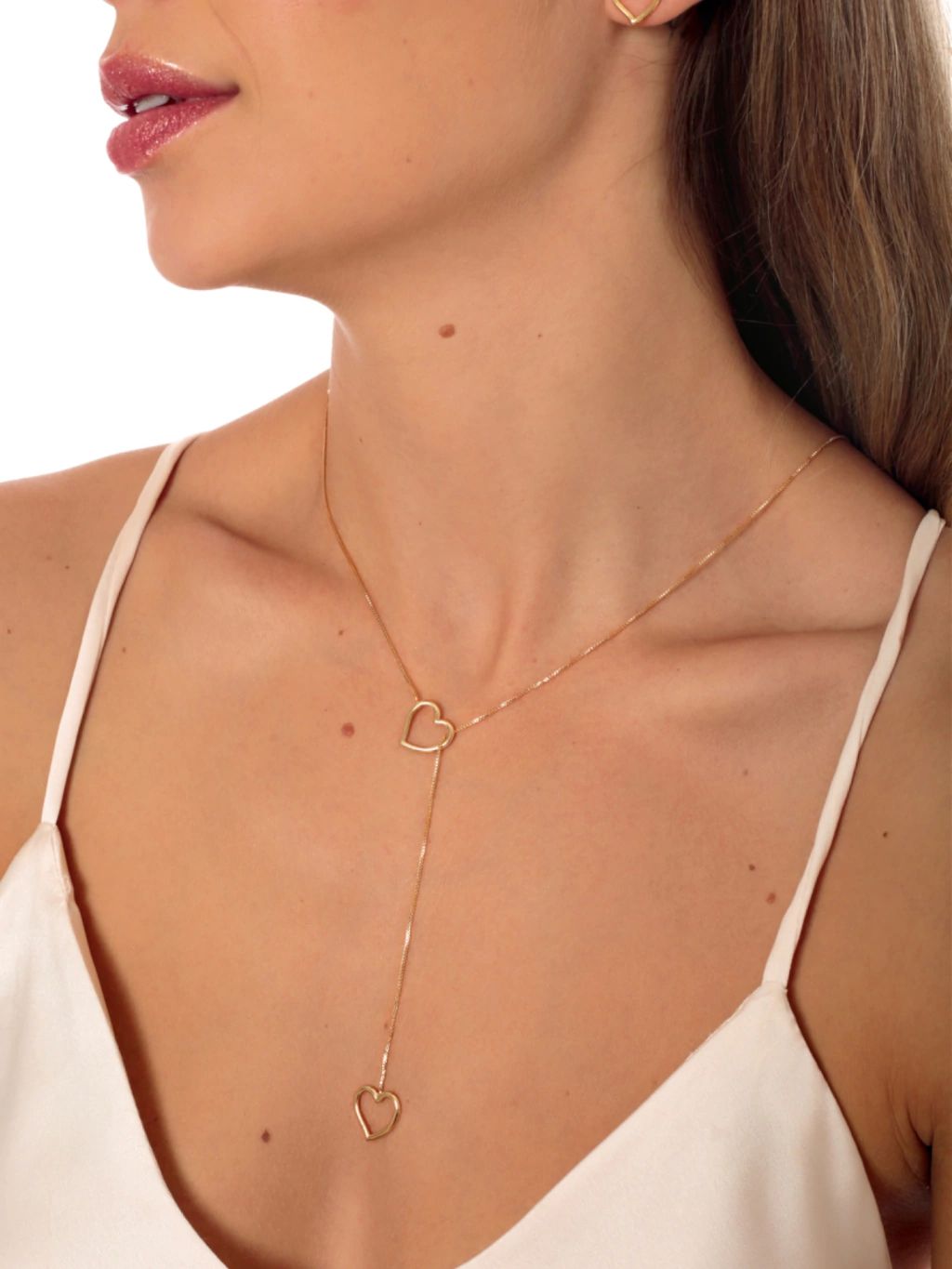 Um colar encantador que une delicadeza e sofisticação. O colar possui um design moderno com dois pingentes em formato de coração vazado, ligados por uma corrente fina que cria um elegante efeito alongado no colo, valorizando o visual com leveza e feminilidade.