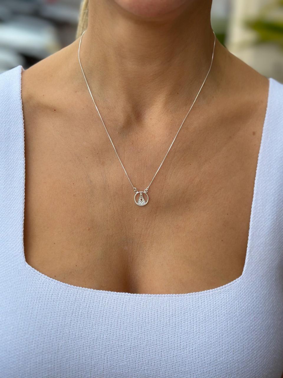 O modelo traz um pingente de Nossa Senhora Aparecida, símbolo de proteção, devoção e bênçãos. O medalhão possui um acabamento trabalhado ao redor, com detalhes que destacam ainda mais a imagem central, trazendo brilho e sofisticação à peça.