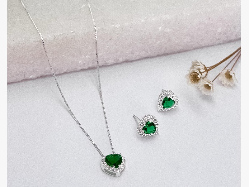 Conjunto Coração Verde Cravejado Prata 925
