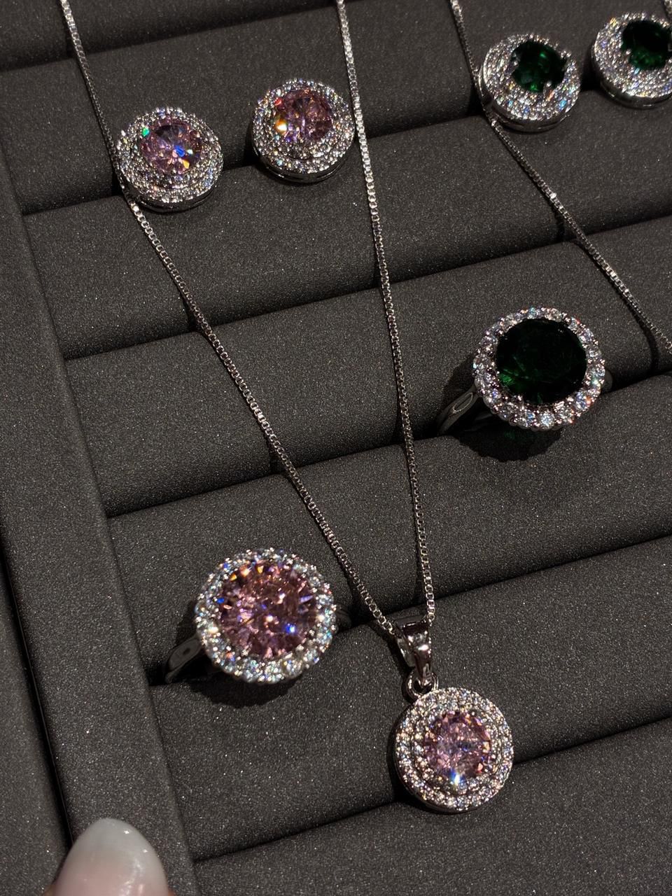 Com design clássico e sofisticado, as peças trazem uma pedra central em tom rosé, envolvida por um halo de pequenas pedras brilhantes que realçam ainda mais o seu brilho. O colar possui um pingente delicado que ilumina o colo, enquanto os brincos completam o visual com equilíbrio e sutileza.